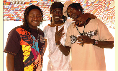 Rapper"Monza" (centre) poses with "Son of Street" (right) and an unidentified young participant at a Nouakchott hip-hop workshop. [Photo by Raby Ould Idoumou]