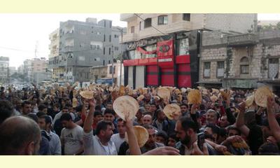 En Syrie, des manifestants de la ville portuaire de Baniyas brandissent des galettes de pain et scandent des slogans pour témoigner leur solidarité envers ceux de Deraa, le 3 mai 2011. Copyright REUTERS/Handout