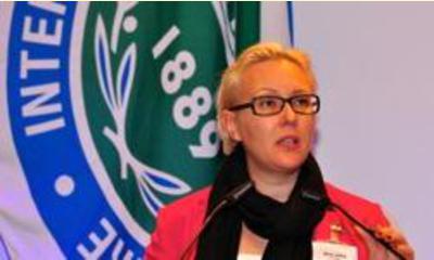 Ms. Maria Lohela (Finland), presenting the resolution to the Assembly. ©IPU/Giancarlo Fortunato