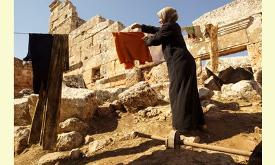 A Syrian woman hangs clothes to dry while taking shelter inside ruins she fled to in fear of shelling near Idlib on October 16, 2013. REUTERS/Loubna Mrie