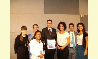 The YAT team with the Deputy Permanent Representative of Argentinia, Mr. Mateo Estreme (center). Team members from left to right: Laura McManus, Matilda Flemming, Iram Parveen, Ariadne Asimakopoulos, David Langle and Paula Ramirez. Photo by team member Gracia Romeral Ortiz Quintilla.