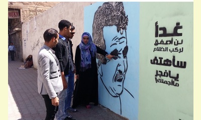 violence.  Tamam al-Shaibani, Muhammad al-Sharie, Yasser al-Mujahid and Atheer al-Mujahid stand near a message and picture of Yemen's most famous poet, Abdullah al-Baradouni. [Faisal Darem/Al-Shorfa]