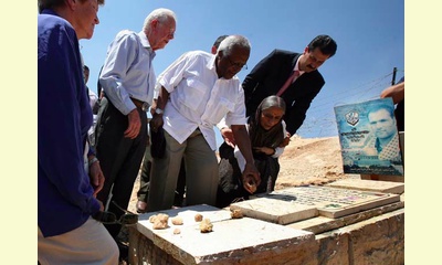 the Israeli occupation.  Retired Anglican Archbishop Desmond Tutu, center, placed a stone on a grave on Thursday, Aug. 27, 2009, in Bilin, site of weekly protests against the Israeli barrier that bisects the village. (Photo: Rina Castelnuovo / The New York Times)