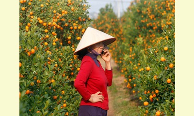 empowering women and improving health and education.  A woman uses a mobile phone near kumquat trees in Hanoi, Vietnam, 2014 (Courtesy Reuters/Kham).