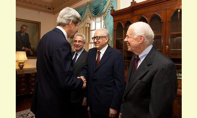 A delegation of Elders met with US Secretary of State John Kerry. Left to right: John Kerry, Ernesto Zedillo, Lakhdar Brahimi, Jimmy Carter